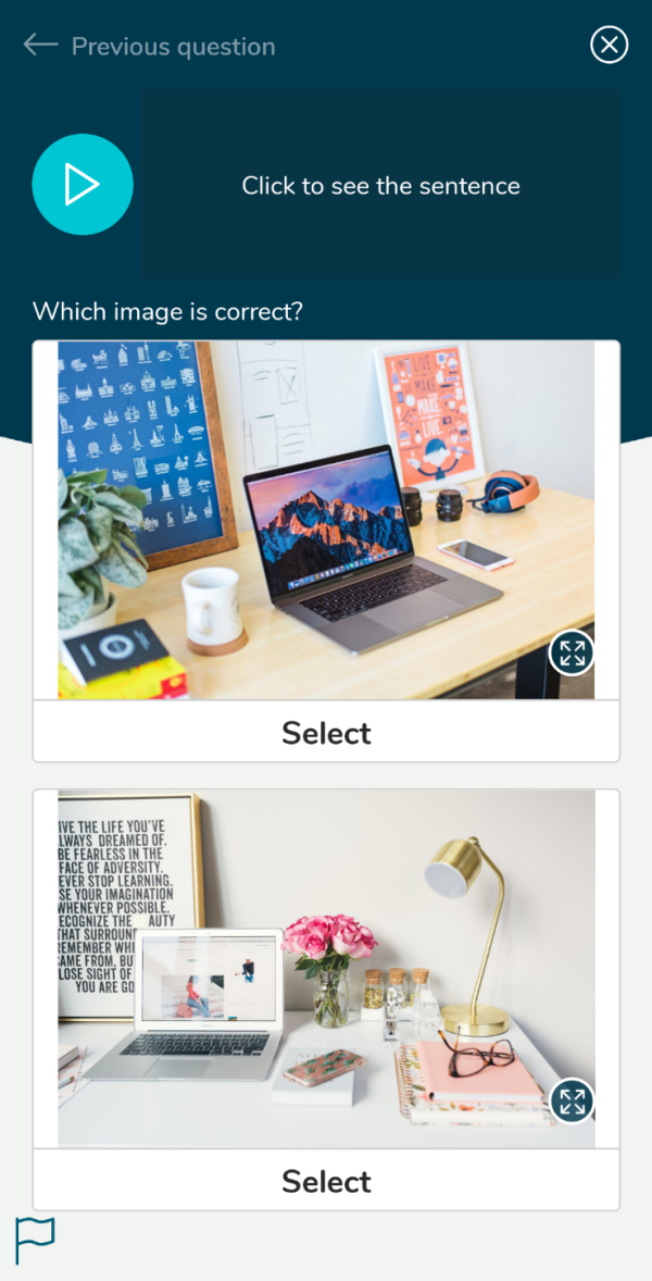 Afine seus ouvidos e aguce seus olhos! Ouça uma frase e, em seguida, escolha a imagem correspondente. Essa aventura sensorial treina suas habilidades auditivas enquanto conecta a linguagem a imagens do mundo real. Perfeito para alunos visuais e para aqueles que adoram dar vida às palavras por meio de imagens! Pode ser encontrado em Stories.