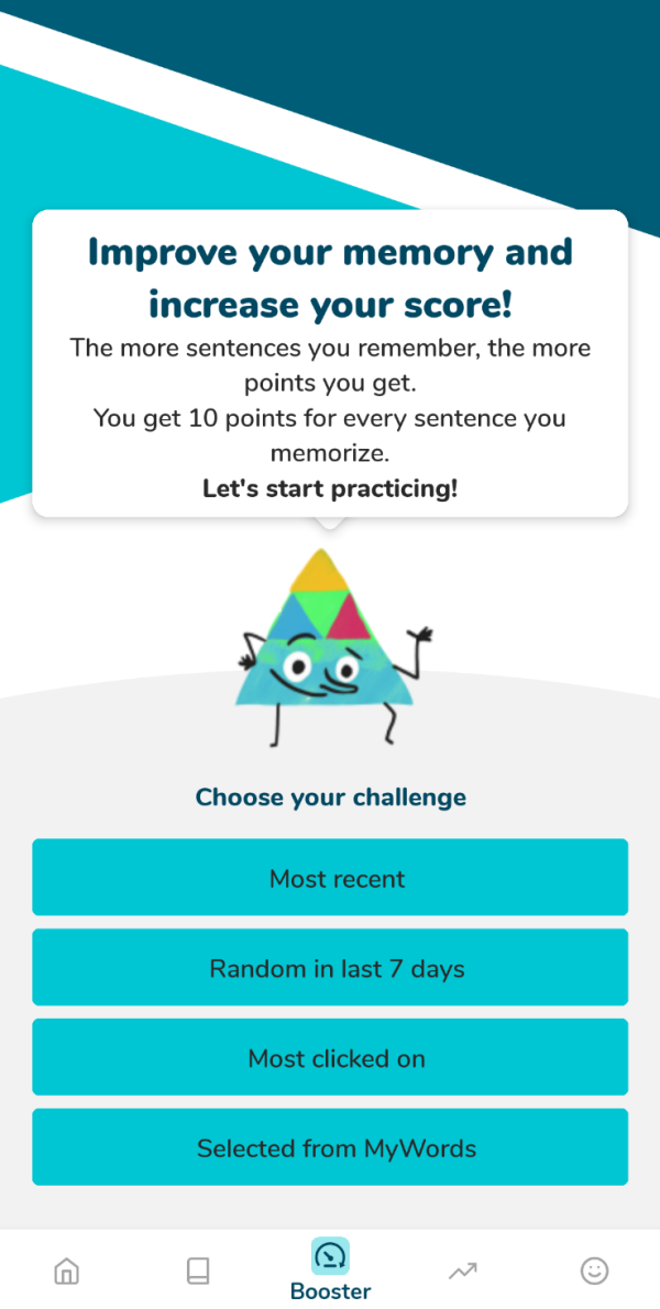 Potencialize sua prática de Sentences com o Booster - sua academia pessoal de idiomas! Escolha seu próprio exercício. Com opções como “Mais recente”, “Aleatório nos últimos 7 dias”, “Mais clicado” e “Selecionado de MinhasPalavras”, você tem o controle do seu condicionamento físico no idioma. Flexione seus músculos linguísticos e veja sua fluência aumentar!