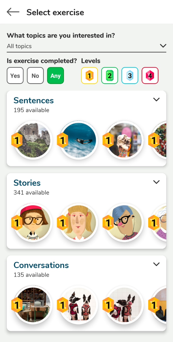 Escolha entre uma variedade de tipos de exercícios e níveis de dificuldade para personalizar sua experiência de aprendizado de idiomas. Se você estiver interessado em praticar frases, mergulhar em histórias ou participar de conversas, nosso recurso de seleção de exercícios permite que você se concentre nas áreas que mais lhe interessam.